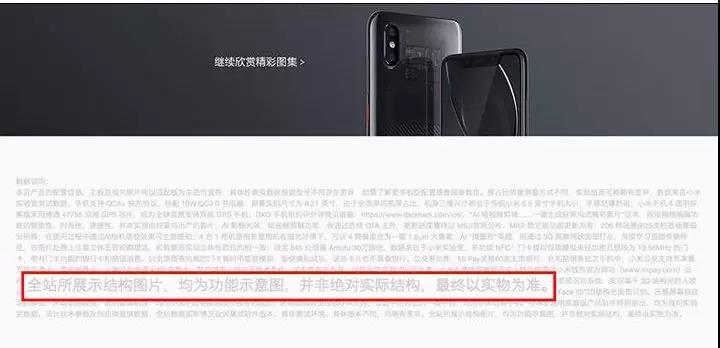 從小米8透明探索版網(wǎng)頁最底下的數(shù)據(jù)說明也寫著“全站所展示結(jié)構(gòu)圖片,均為功能示意圖,并非絕對(duì)實(shí)際結(jié)構(gòu),最終以實(shí)物為準(zhǔn)。”