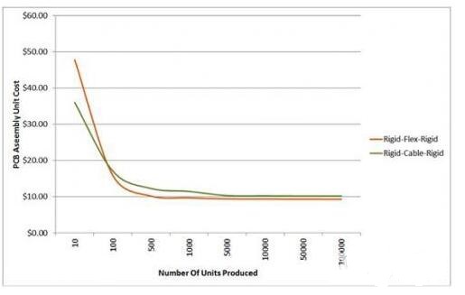 圖1:軟硬結(jié)合設(shè)計(jì)和電纜連接的剛性PCB組裝成本比較
