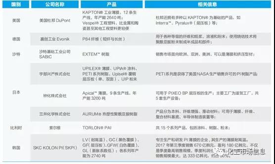 2018年,全球有約200家聚酰亞胺生產商,但由于聚酰亞胺技術壁壘高,因此全球聚酰亞胺產能主要集中在美日德等國的化工巨頭手上,主要的生產廠家有美國杜邦公司、日本鐘淵公司、日本宇部興產公司等。
