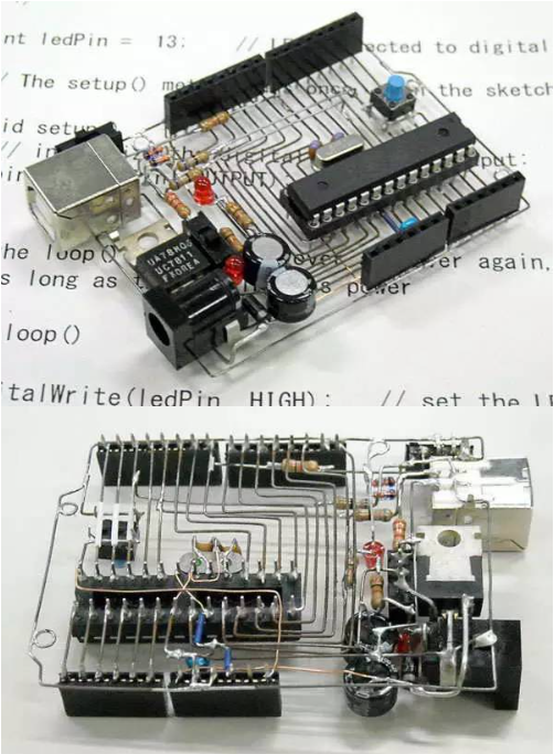 對于萬能板的焊接方法,一般是利用前面提到的細導線進行飛線連接,飛線連接沒有太大的技巧,但盡量做到水平和豎直走線,整潔清晰如下圖。