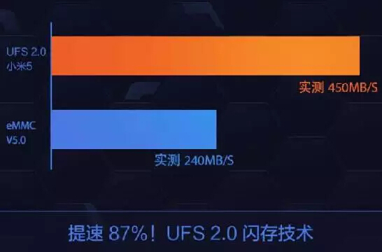 閃存技術提升讓手機加載速度更快,小米5采用的下一代UFS 2.0閃存技術,支持數據同時讀寫,比上一代eMMC閃存快了87%。