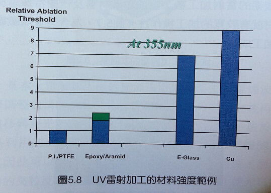 一般而言,不同的材料會(huì)有不同的光學(xué)吸收率,因此吸收率越高的材料就越容易加工。但是電路板本身就會(huì)有三種不同的物質(zhì)在里面,因此會(huì)產(chǎn)生加工速率的差異。另外不同的材料也有不同的破壞強(qiáng)度,因此不同的材料與不同的雷射機(jī)種就會(huì)產(chǎn)生不同的材料破壞強(qiáng)度模式關(guān)系。圖5.8所示,為一種紫外光雷射機(jī)種對(duì)HDI線路板材料加工時(shí)所測(cè)得的材料破壞強(qiáng)度范例。