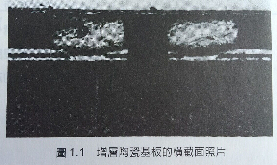 演變到現在,又將增層法的概念導入目前晶片封裝技術所用的基板。大型電腦中所用晶片封裝模組,自1970年代開始發展以來便一直使用在陶瓷基層上形成銅導線和聚亞醯胺絕緣層的增層電路板技術。圖1.1是增層陶瓷基板的橫截面照片,在陶瓷基板上具有一層增層絕緣層,絕緣層上下方的線路可以經由栓孔導通并以覆晶方式將晶片封裝到基板上。圖1.2是1980年代所使用熱導模組的照片。在晶片周圍區域具有銅和聚亞醯胺的增層線路。熱導模組是典型高密度增層HDI電路板的實例。